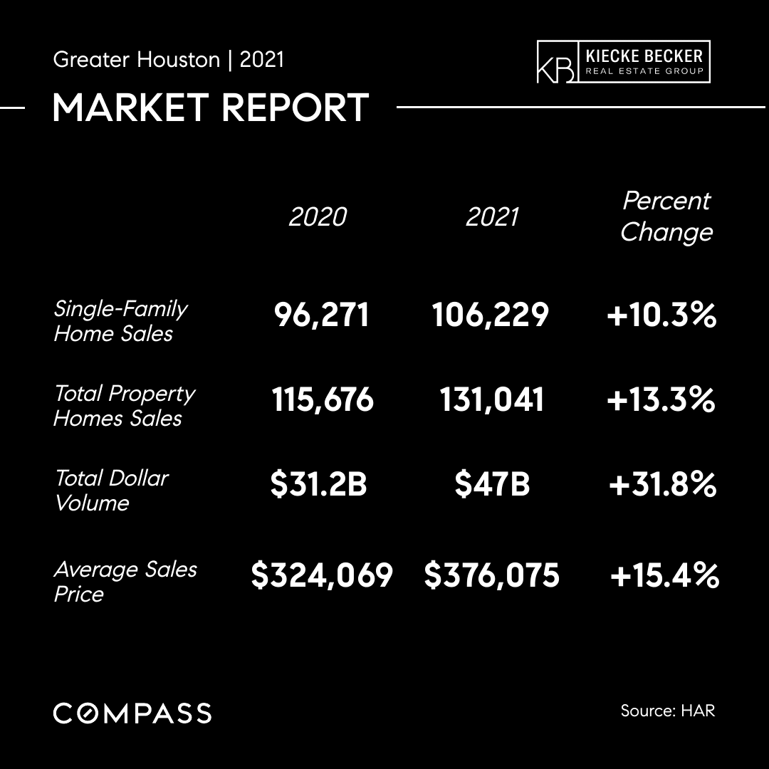 The ongoing health pandemic, historically low inventory, and rising home prices were no match for the increase in consumer demand for housing in and around the Bayou City. The Houston real estate market carried the positive momentum, from the previous record-setting year in 2020, to shatter EVERY. SINGLE. previous record set.