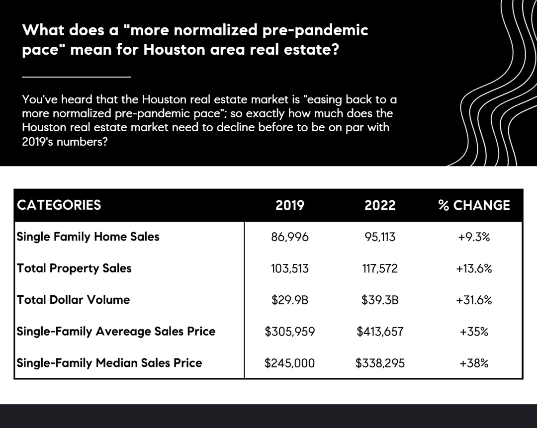 You’ve heard that the Houston real estate market is easing back to “a more normalized pre-pandemic pace”; so exactly how much does the local market need to decline to be on par with 2019’s numbers? I’m glad you asked!
