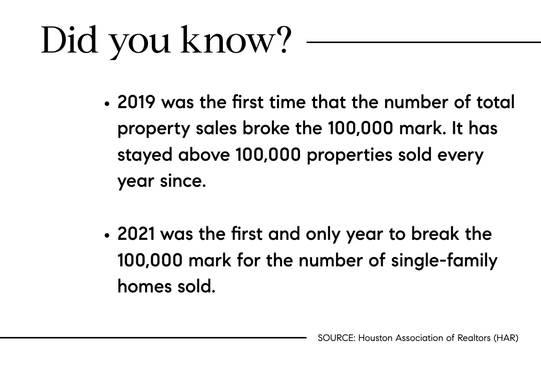 Did you know that starting in 2019, the Houston real estate market began a consecutive three-year streak of setting new records in all of five categories? Then the next year would break all the previous year’s records to cement its place as the new record-setting year. That streak came to an end in 2022.