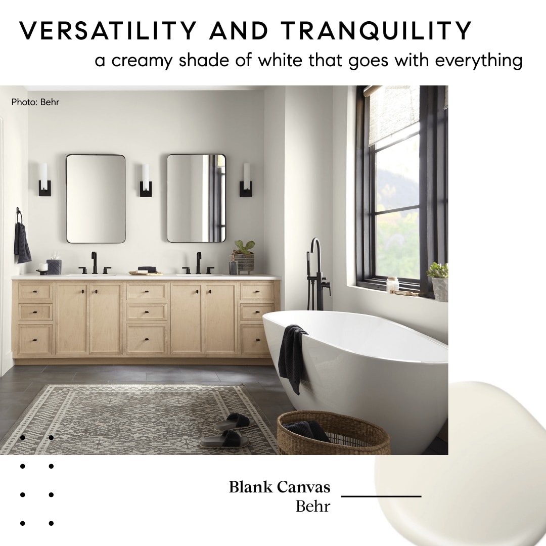 "Blank Canvas effortlessly offers a clean and inviting blank slate that allows individuality and creativity to flow freely. This white easily harmonizes with a wide range of hues, including neutrals, earth tones, and pastels for a charming and cozy appeal." --Erika Woelfel, vice president of color and creative services at Behr