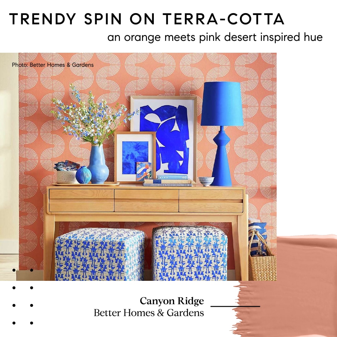 Referencing the color wheel and its relationship between colors, BHG Style and Design Director Jessica Thomas provided great tips for using this soft terra-cotta hue with a vibrant cobalt for a fresh modern look, tweaking the tone of blue to a darker denim color to create a rustic vibe, or pairing it with navy if your design style is more traditional.