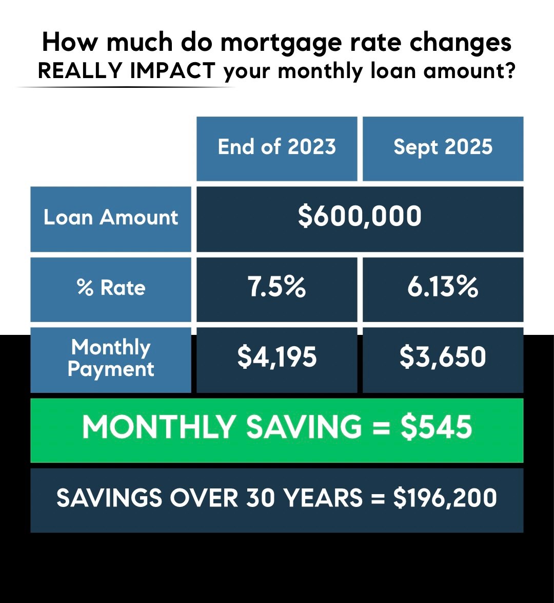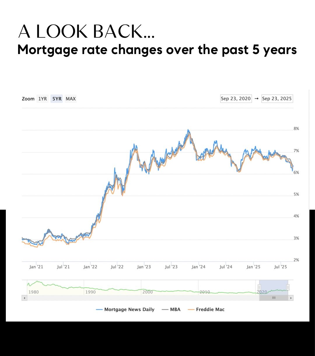 Short answer: As of this week, mortgage rates are sitting near the low 6s. The lowest level in almost three years after a sharp drop that began on Sept 5. If today’s payment works and you find the right home, moving sooner makes sense because even small additional rate dips tend to pull more buyers back into the market, pushing competition and prices higher.