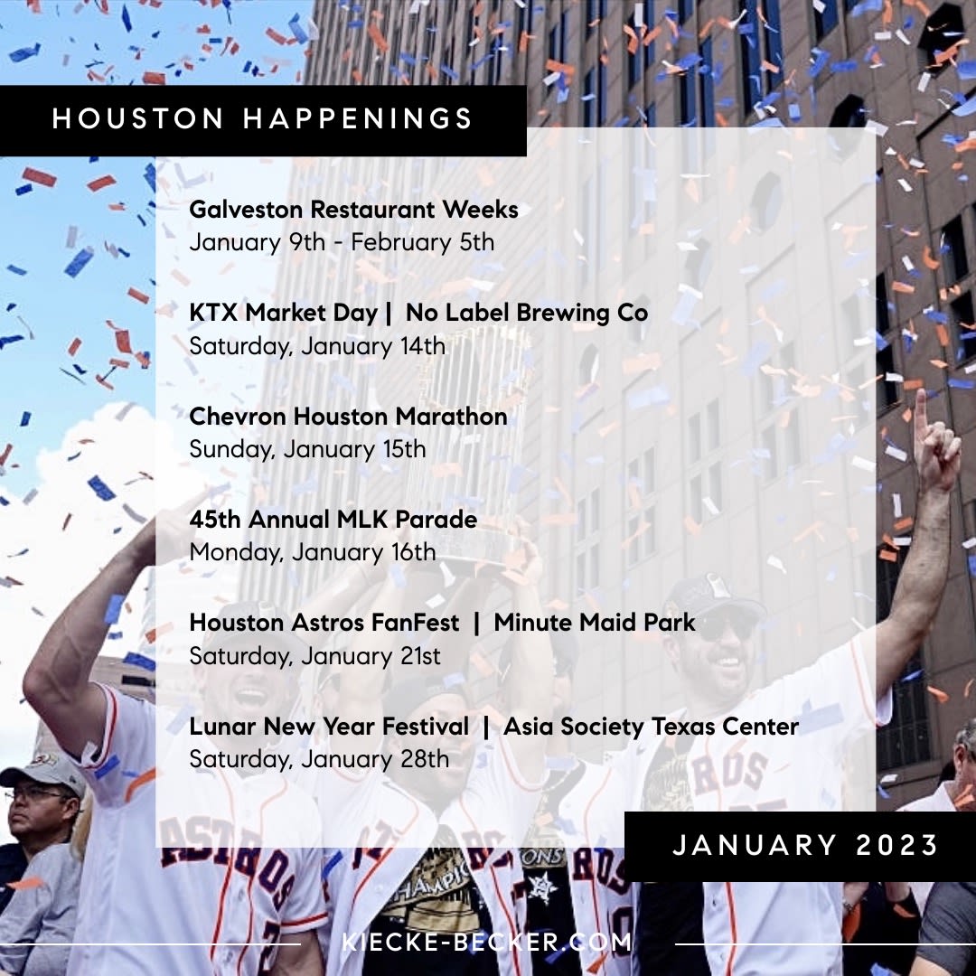 There is something for everyone to start off your new year in Houston! Head to the coast to try out top dishes from the Island's best eateries, celebrate our Houston Astros at FanFest, line up to cheer on thousands of runners, witness the marching bands and floats at the 45th annual MLK parade, or celebrate the Lunar New Year with cultural performances, arts and crafts activities, and the best of globally inspired foods!