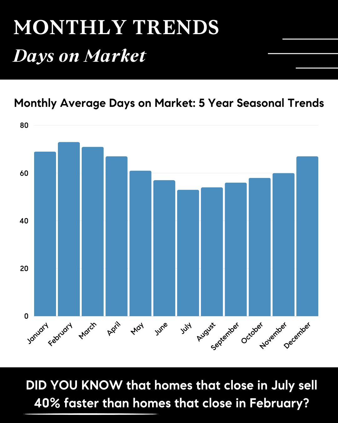 Swift Sales in Summer: If you're aiming for a quick sale, July is your month. Homes sell 40% faster compared to those closing in February. List in May or June for the fastest results.