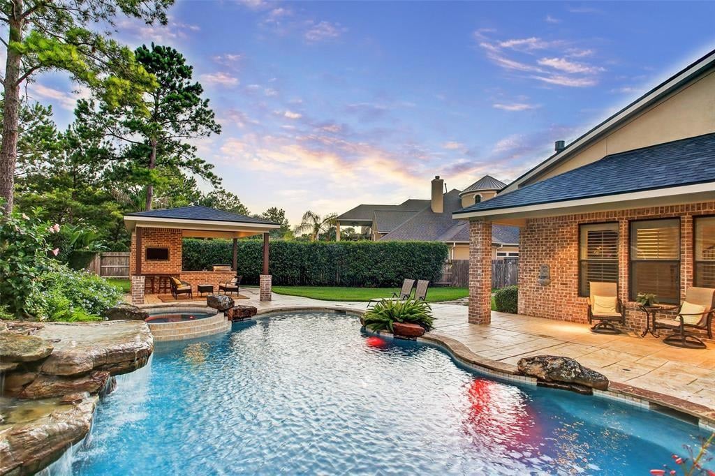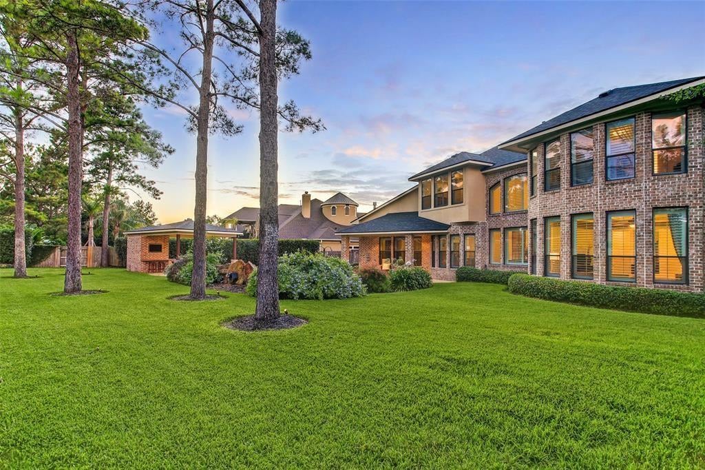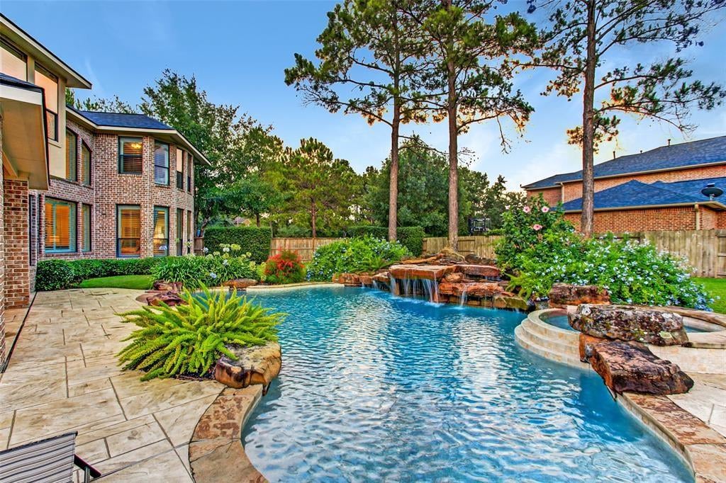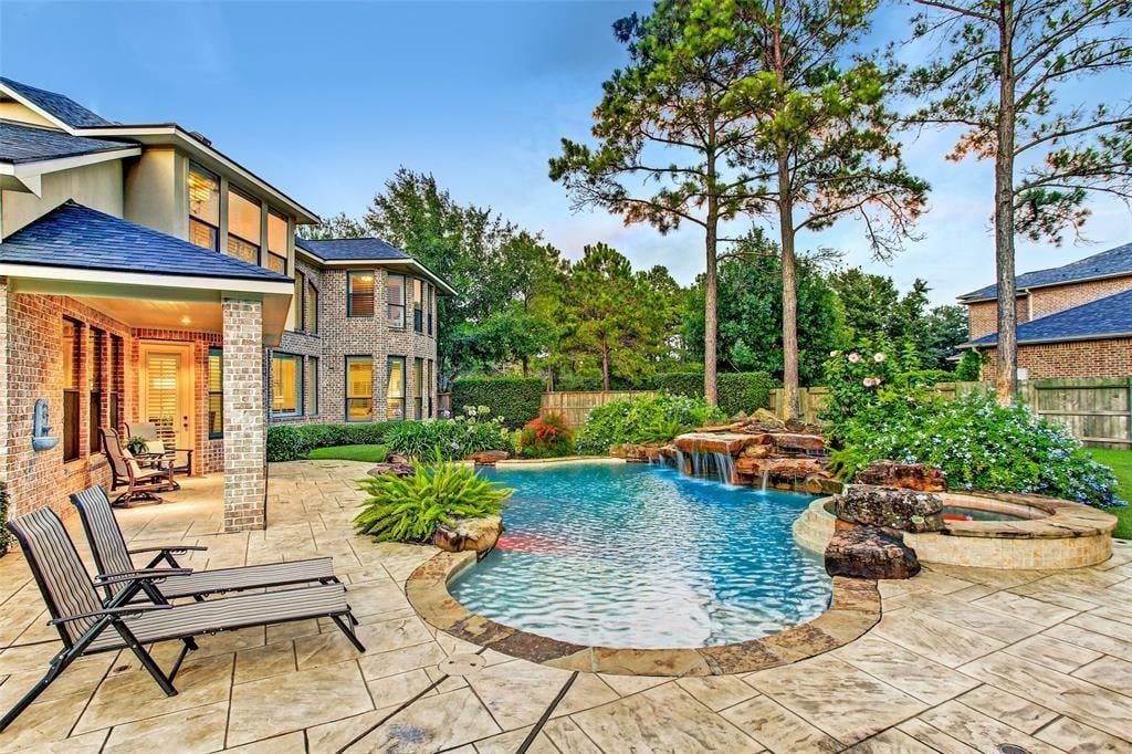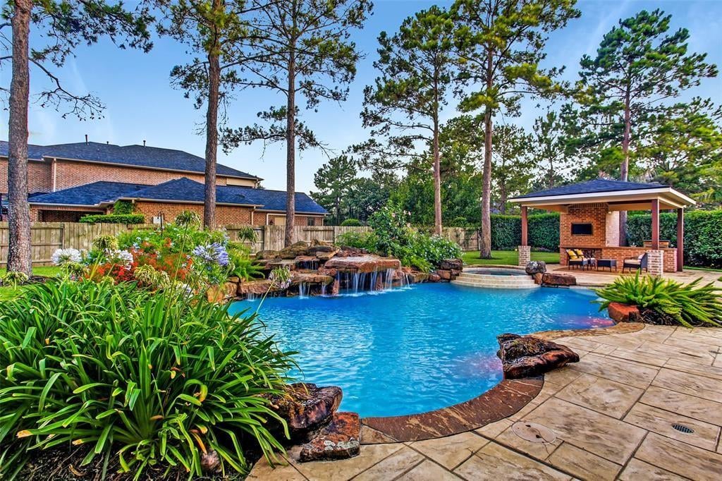 Immaculate custom home in the heart of Cinco Ranch's prestigious gated community of Bayou Woods is perfectly situated on a sizable corner cul de sac lot. Impressive two-story entry, living and dining room boast 30-foot ceilings, stone accents, and a view of the impressive curved staircase with wood and tile accents and wrought iron balusters. Recently updated kitchen includes high level granite counters, custom painted cabinets, vertically set glass and tile backsplash, double ovens, and gas cooktop. Highly sought after floor plan with 2 bedrooms down, executive study, living-dining room open areas and family room located off the kitchen. Two staircases offer convenient access to the 3 bedrooms, game room and media room located upstairs. Spacious tropical pool is the focal point of this lush backyard paradise complete with 2 covered patios, outdoor kitchen, cabana bath, and plenty of green space. NEW ROOF, NO FLOODING, zoned to exemplary Katy ISD schools and convenient to La Centerra.