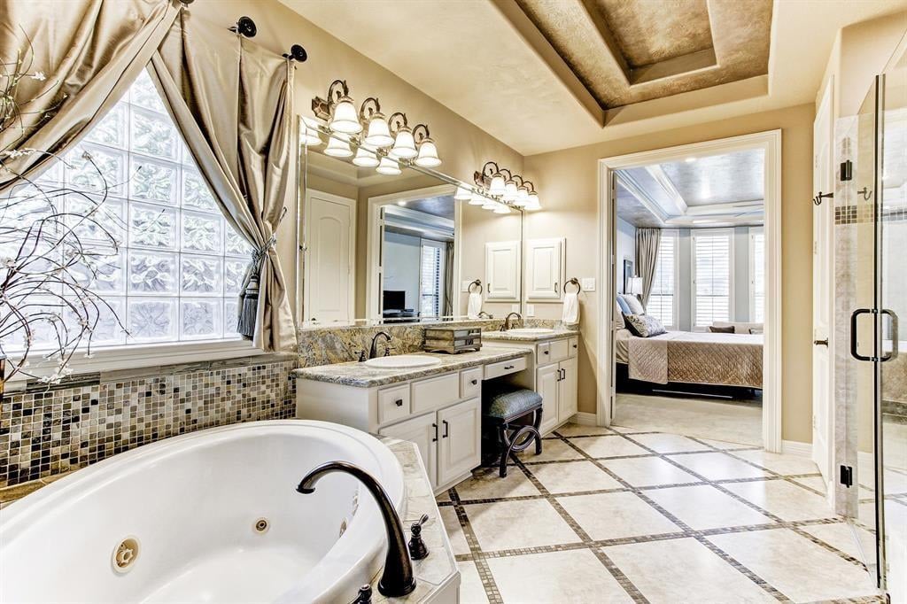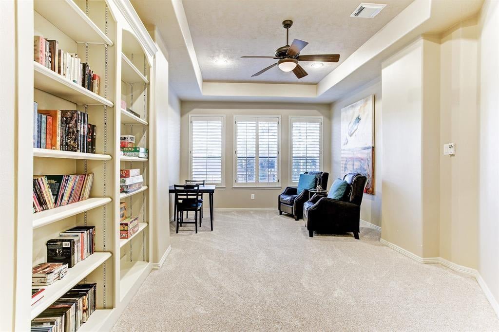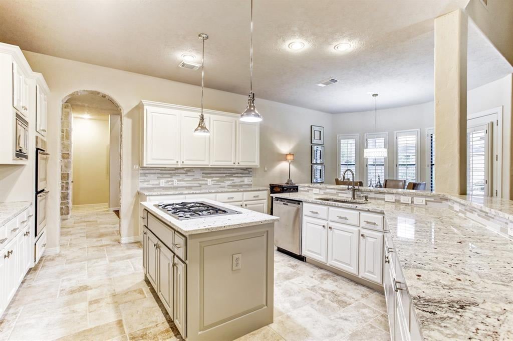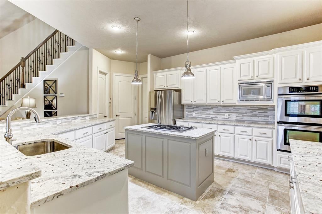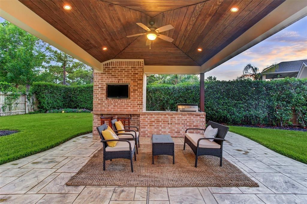 Immaculate custom home in the heart of Cinco Ranch's prestigious gated community of Bayou Woods is perfectly situated on a sizable corner cul de sac lot. Impressive two-story entry, living and dining room boast 30-foot ceilings, stone accents, and a view of the impressive curved staircase with wood and tile accents and wrought iron balusters. Recently updated kitchen includes high level granite counters, custom painted cabinets, vertically set glass and tile backsplash, double ovens, and gas cooktop. Highly sought after floor plan with 2 bedrooms down, executive study, living-dining room open areas and family room located off the kitchen. Two staircases offer convenient access to the 3 bedrooms, game room and media room located upstairs. Spacious tropical pool is the focal point of this lush backyard paradise complete with 2 covered patios, outdoor kitchen, cabana bath, and plenty of green space. NEW ROOF, NO FLOODING, zoned to exemplary Katy ISD schools and convenient to La Centerra.